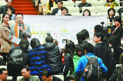 图片说明:“这些多余的审批项目都该‘打叉’!把它送进历史。”2015年1月5日,李克强在广东自贸区南沙片区,指着一张长4米、耗时近800天的投资项目审批流程图说。得知改革后审批时间缩短为原来的1/5,总理说,“万里审批图”制约市场活力,容易滋生腐败。广东要继续先行先试,为“三规合一”等改革探路。